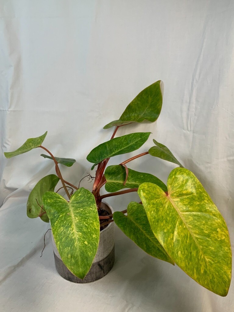 The petioles are a stunning dark red and they are a lot sturdier than the ones of the normal Philodendron Painted Lady. Leaves begin neon yellow and only fade a bit to deeper green with heavy mottling. Philodendron Painted Lady is a hybrid plant of two-parent Philodendrons namely P.